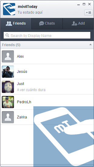 Para chatear con nuestros amigos bastará como ya he dicho, con irnos a la pestaña «friends» y hacer doble clic sobre ellos para iniciar la conversación, o también, sea cual sea la pestaña donde nos encontremos, desde el icono de opciones que se encuentra en la parte superior derecha, que aparece como un cuadro con una flecha señalando hacía abajo y cuatro flechas horizontales superpuestas entre sí y hacer clic sobre «Add chat» y seleccionar contacto.