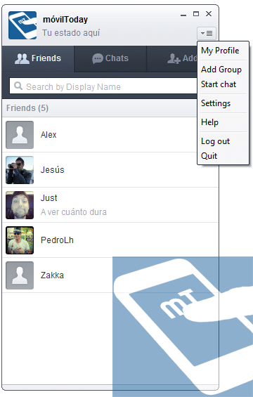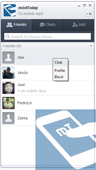 También desde esta pantalla, haciendo clic con el botón derecho sobre un amigo podremos bloquear (block), ver su perfil (profile) o comenzar también la conversación (chat).