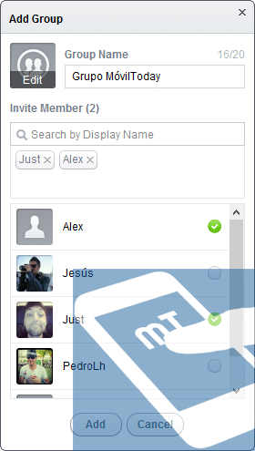 Haciendo clic sobre «add Group» aparecerá una ventana como la que se muestra abajo, donde deberemos poner el nombre del grupo, seleccionar a los contactos que queramos agregar y opcionalmente, la fotografía del mismo. Una vez hecho esto el grupo aparecerá en chats, y dispondrá de las mismas opciones que las conversaciones individuales.