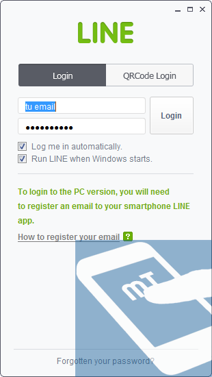 Cuando esté instalada haremos doble clic sobre ella para ejecutarla y a continuación nos aparecerá la ventana de inicio de sesión donde tendremos que introducir el correo electrónico y contraseña que registramos con anterioridad en LINE en nuestro teléfono.
