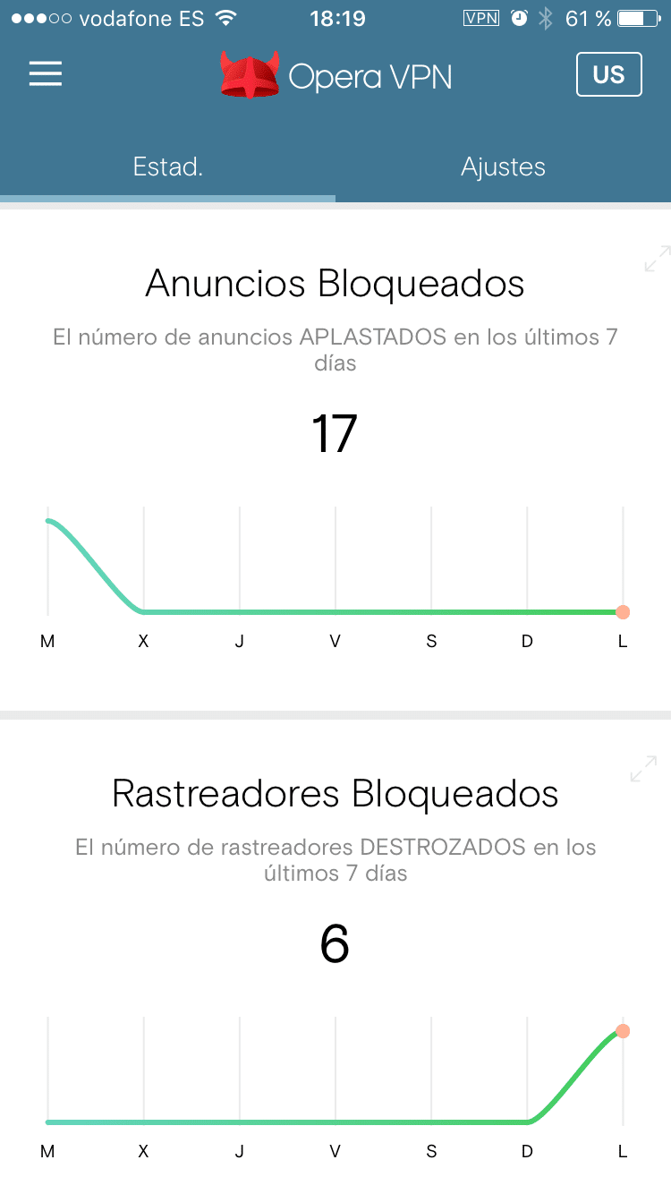 Esta es mi favorita. La velocidad de navegación es bastante aceptable, es gratuita y cuenta con bloqueador de anuncios y anulador de rastreadores. Además, muestra en una gráfica de la pantalla principal los anuncios y rastreadores que ha eliminado