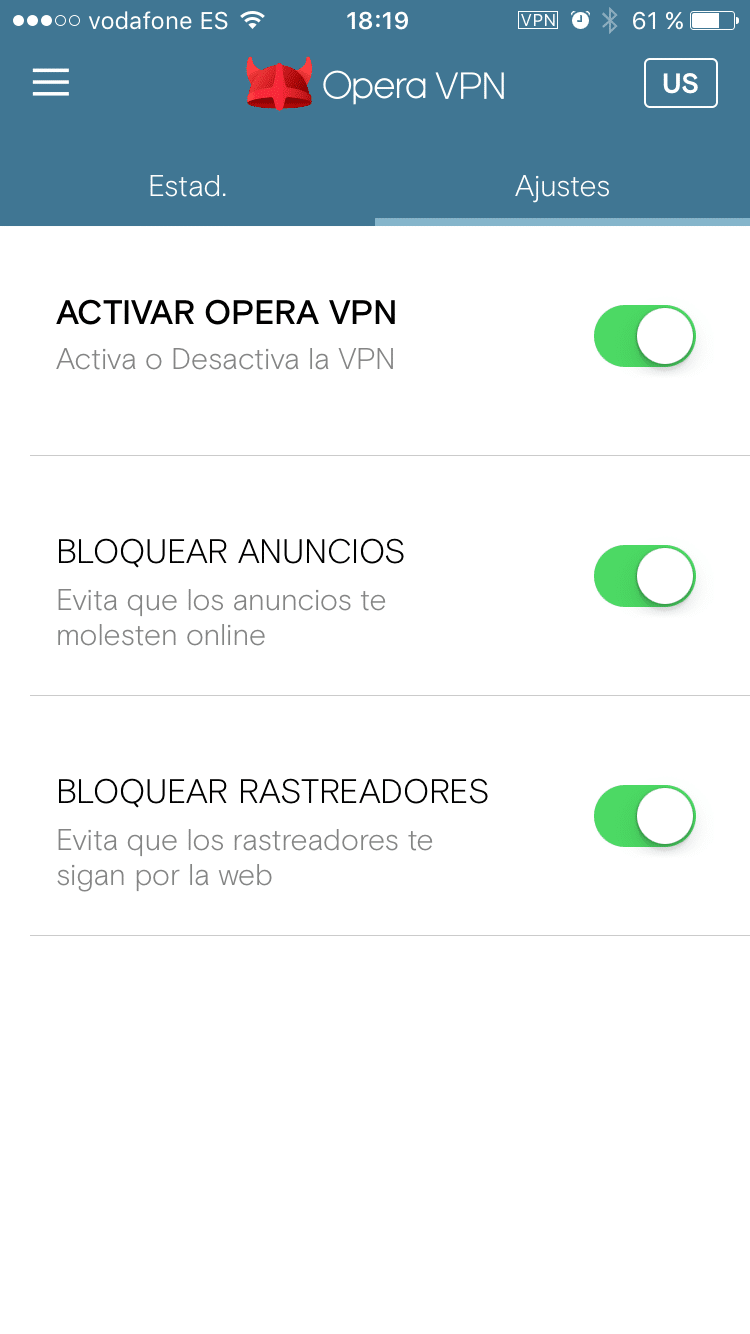 La interfaz es muy simple e intuitiva. Pulsamos en activar para encenderla y listo. En la segunda pantalla están las opciones para encender/apagar la VPN y para activar o desactivar el bloqueo de anucios y rastreadores. Desde el menú que se abre pulsando sobre un icono en la zona superior derecha de la pantalla podremos cambiar de localización para navegar. No hay muchos, pero si lo que quieres es saltarte bloqueos cualquiera sirve.