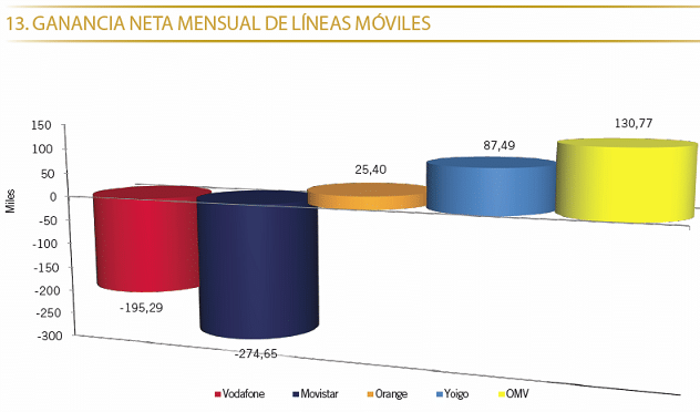 En portabilidades no cambia la película y los grandes también perdieron líneas, Vodafone perdió 69.202 líneas y Movistar 93.077, Orange ganó 26.517 líneas, los OMV 64.371 líneas y Yoigo 71.391.