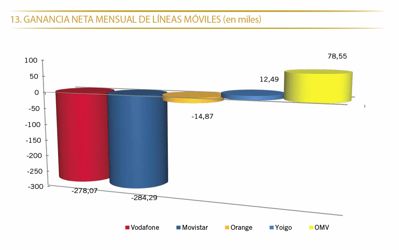 La ganancia neta mensual de líneas arroja números verdes tan solo para los OMVs que ganaron 78.550 líneas y Yoigo que ganó 12.490, Orange perdió 14.870 líneas, Vodafone 278.070 y Movistar 284.290 líneas.