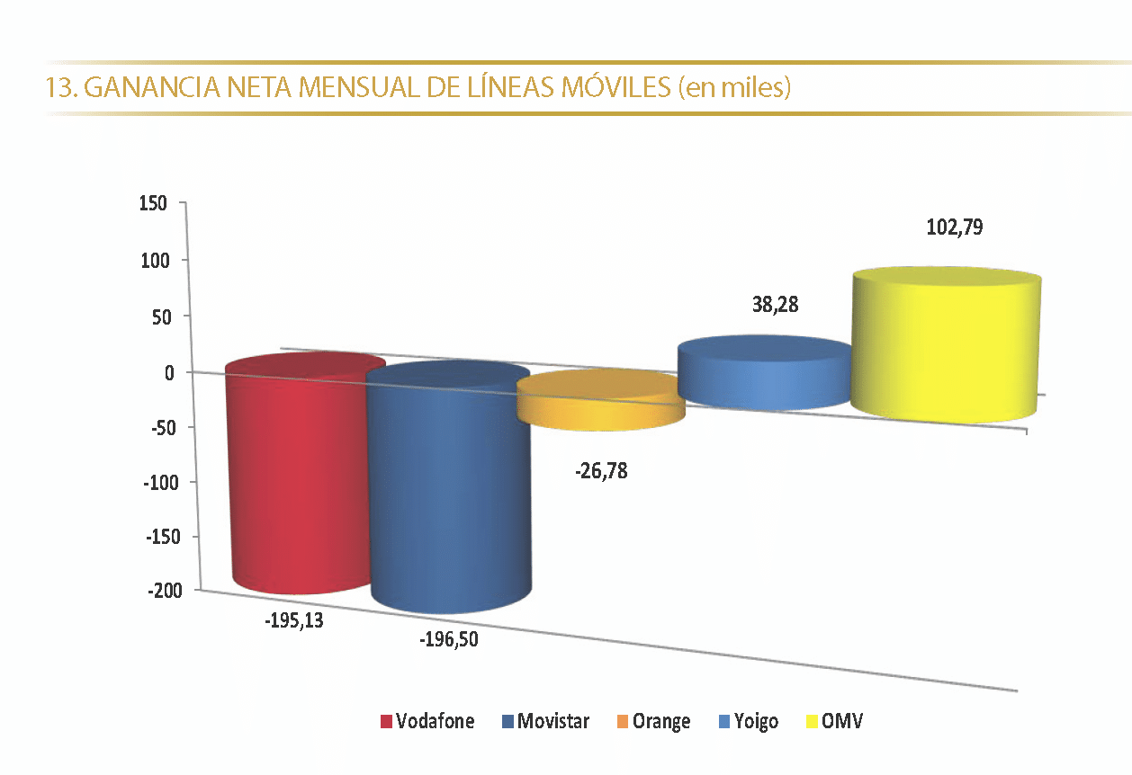 Los OMV ganaron 102.790 líneas y solo Yoigo les pudo acompañar con 38.280 líneas, los grandes perdieron, Orange 26.780, Vodafone 195.130 y Movistar 196.500 líneas menos en un mes.
