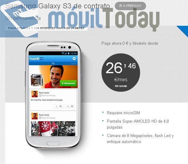 - Samsung Galaxy S 3: pago único de 635€ o 26,46 € al mes durante 24 meses