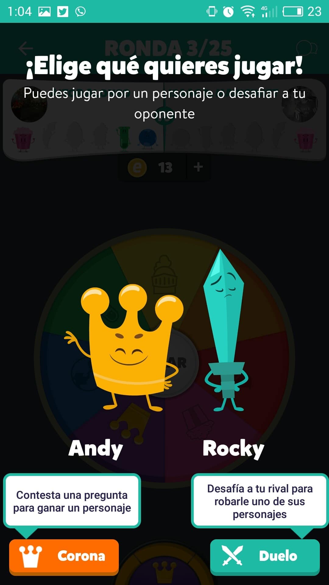 Para seleccionar la pregunta que deberemos responder disponemos de una ruleta que cuenta con cada tema a preguntar y con una corona que, si caes ahí, podrás elegir a consciencia el tema sobre el cual deberás responder y conseguir la medalla de cada tema. Si no caemos directamente en la corona deberemos contestar correctamente 3 veces seguidas las preguntas aleatorias que toquen y nos ofrecerá elegir entre conseguir una corona o batirte en duelo con tu adversario para robar una de las suyas.