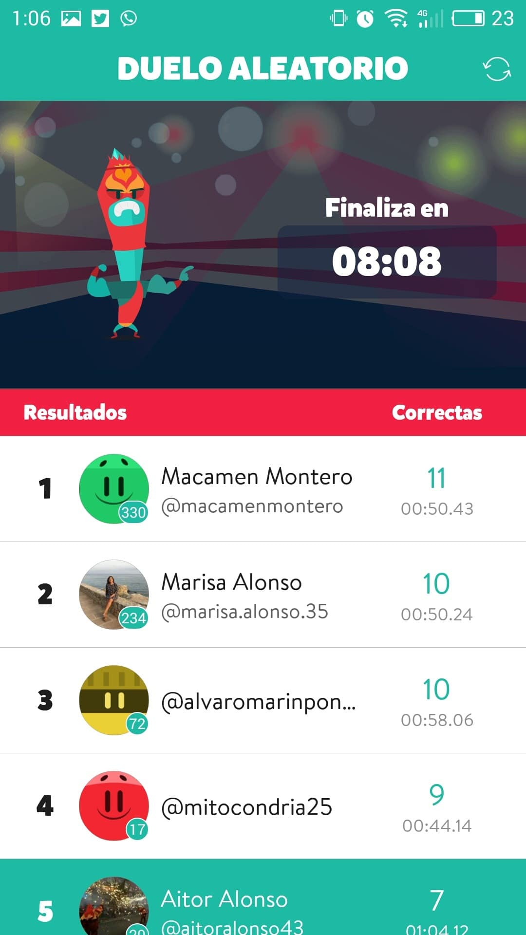 Después está el modo duelo, el cual consiste en intentar contestar correctamente el máximo de preguntas en el menor tiempo posible siendo un total de 12 preguntas y disponiendo de 20 segundos por cada una de ellas.
