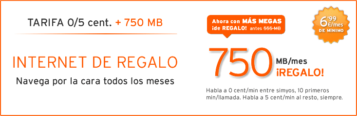 Simyo , OMV con cobertura Orange, mejora su tarifa 0/5 cént añadiendo más MB para navegar a máxima velocidad, ahora incluye 750 MB manteniendo el resto de condiciones. Anteriormente incluía 555 MB.